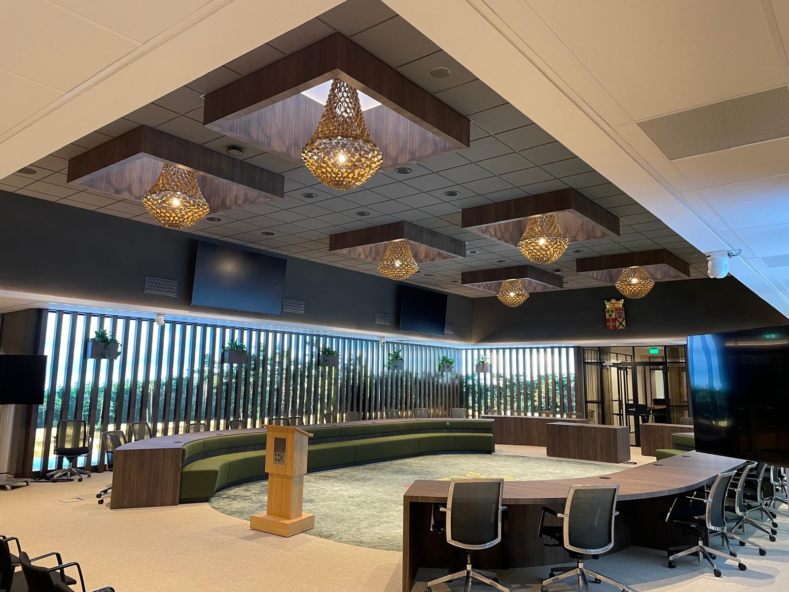 De nieuwe Raadzaal in het Huis van Leusden is voor de komende jaren weer helemaal up to date. Met zijn nieuwe verlichting ook zeer aangenaam om zelfs de lang duurde vergaderingen in bij te wonen.